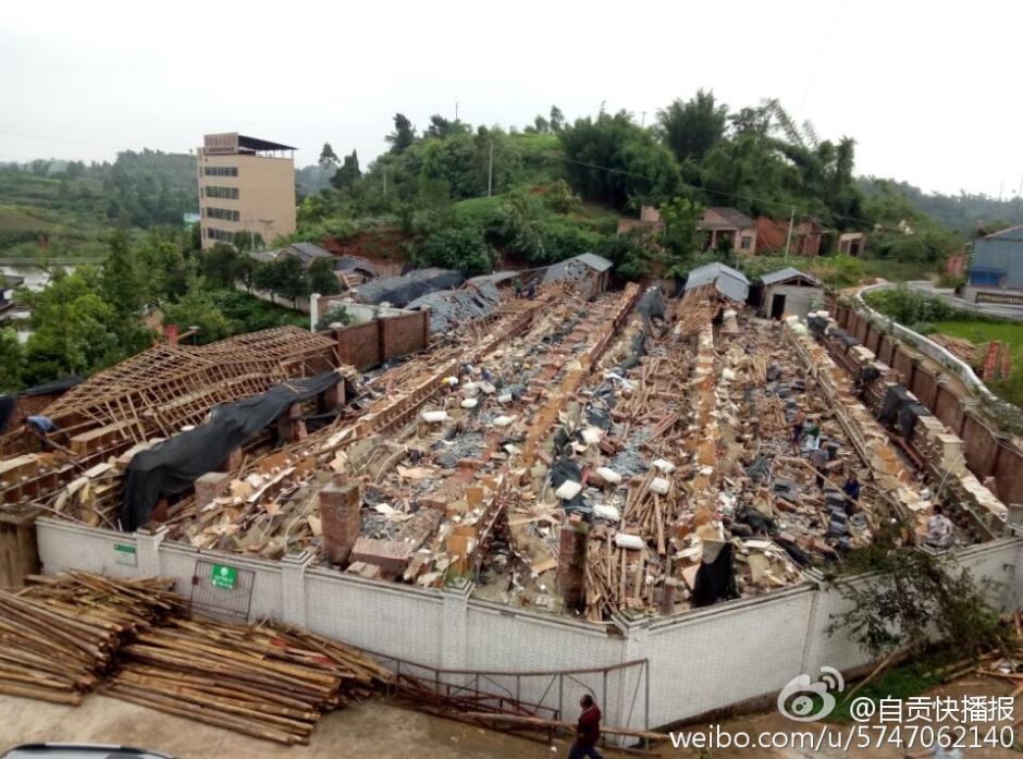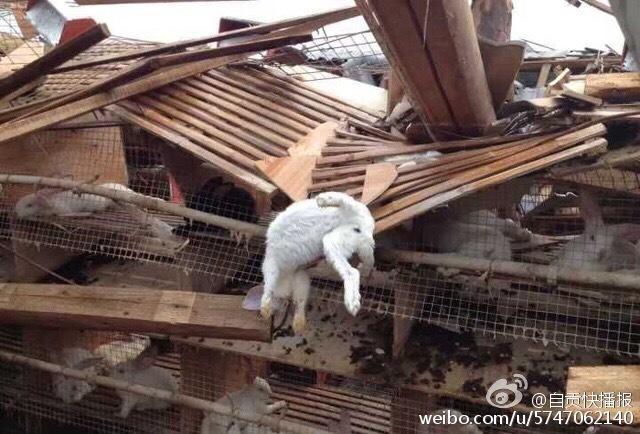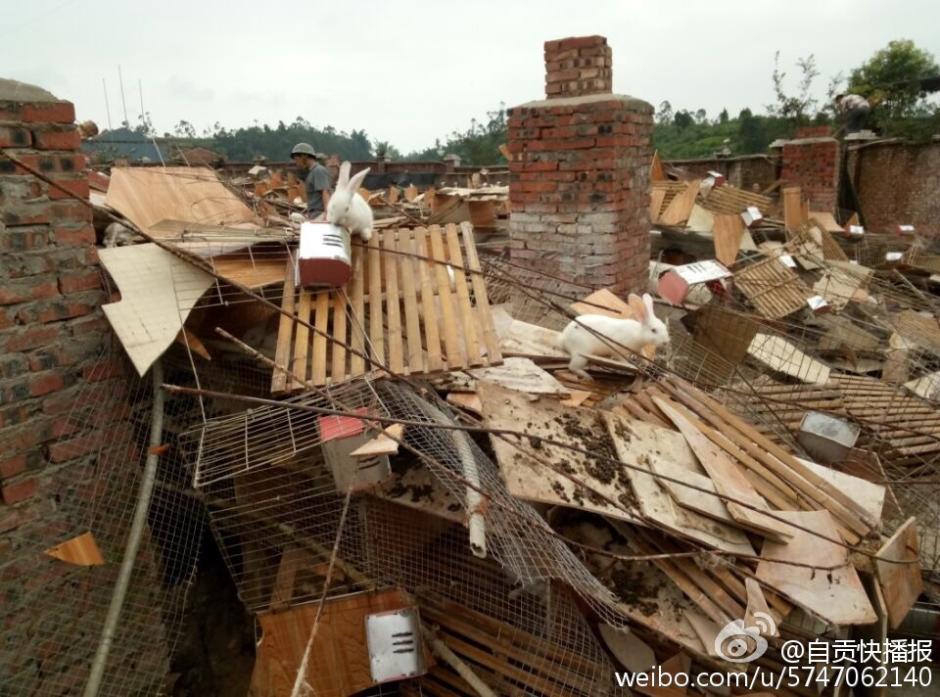 7月12日凌晨5時(shí)許,陣性大風(fēng)突襲四川自貢榮縣古文鎮(zhèn),風(fēng)災(zāi)使古文鎮(zhèn)山邊村鄉(xiāng)巴佬養(yǎng)殖基地6000平米兔舍垮塌,事發(fā)時(shí),該兔舍共有26000只兔子。記者在現(xiàn)場(chǎng)看到,兔舍頂棚已經(jīng)被完全吹跨,木制橫梁和隔板隨處散落,部分兔舍仍有大量兔子被埋,10余名工人正在清理現(xiàn)場(chǎng)和搶救活兔。據(jù)兔舍負(fù)責(zé)人介紹,經(jīng)過(guò)近30多小時(shí)生產(chǎn)自救已搶救出5000余只活兔,初步估計(jì)有10000余只兔子死亡,直接損失超過(guò)300萬(wàn)元。(記者 曹實(shí)秋)圖片來(lái)源:華西都市報(bào)自貢城市頻道官方微博