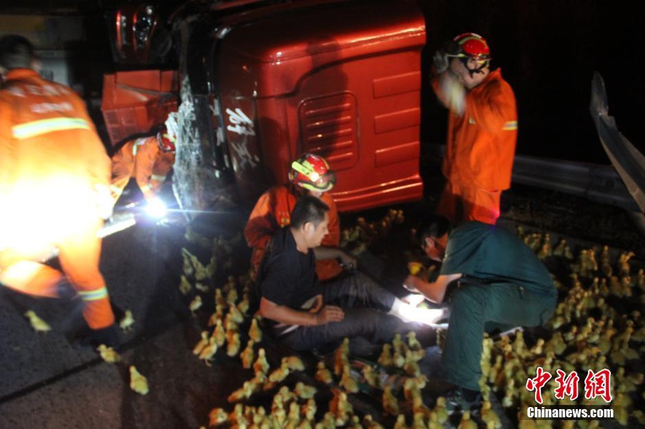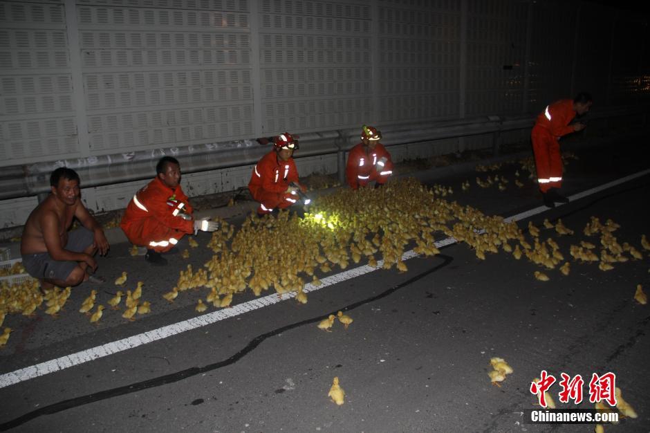 7月26日凌晨,在京臺高速滕北出口往南路段發(fā)生一起車禍,一輛裝滿鴨苗的廂貨車與半掛車發(fā)生追尾,車上3人被困,數(shù)千只鴨苗散落在高速路上。山東省棗莊市滕州消防大隊接到報警后迅速出動,對高速路面上的鴨苗進(jìn)行了驅(qū)趕,疏通高速交通,及時營救出車上被困人員。中新社發(fā) 季龍 攝 圖片來源:CNSPHOTO