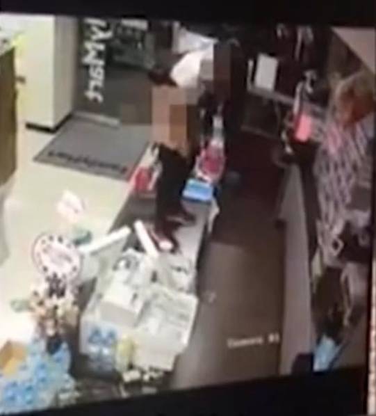 男店員企圖阻止女顧客但不果,之后拿起手機似乎在通報事件,然后男店員便躲到一旁。