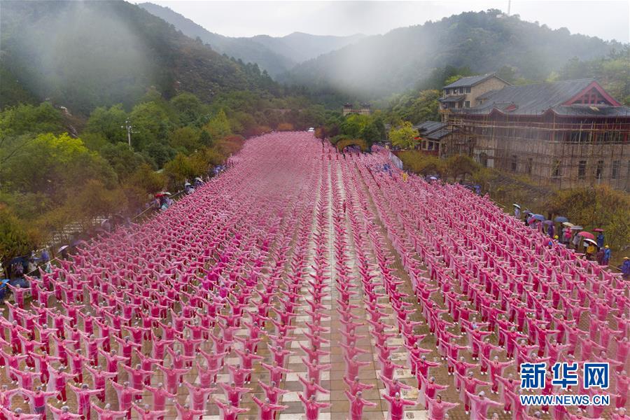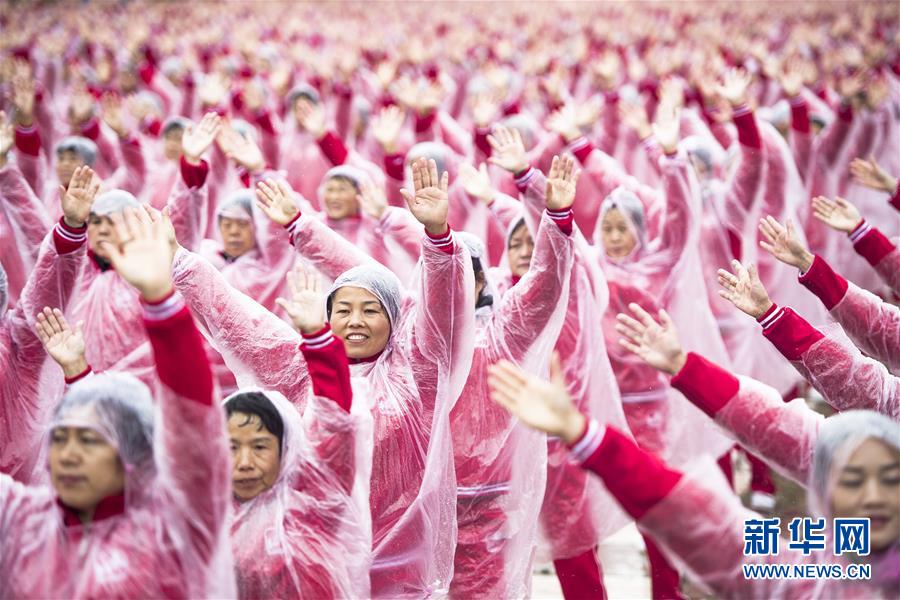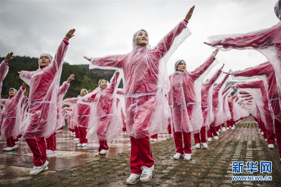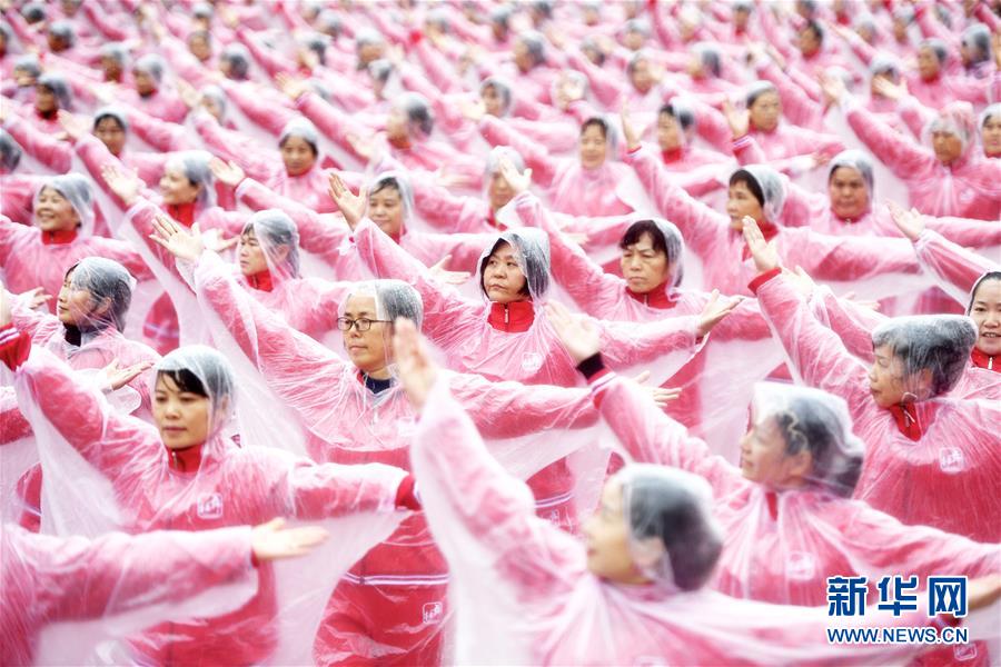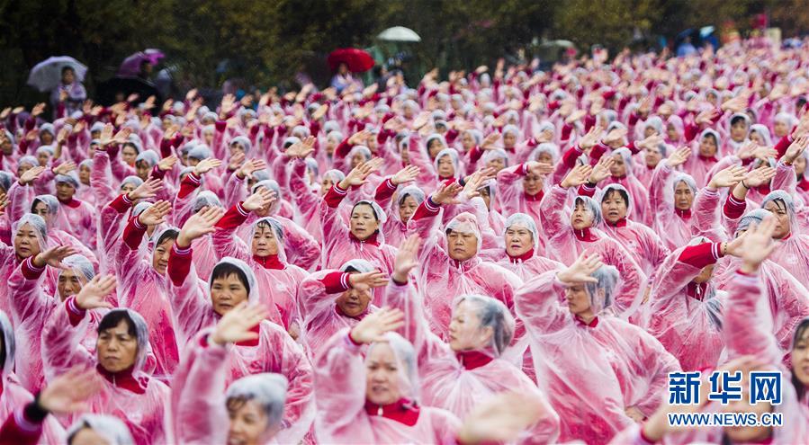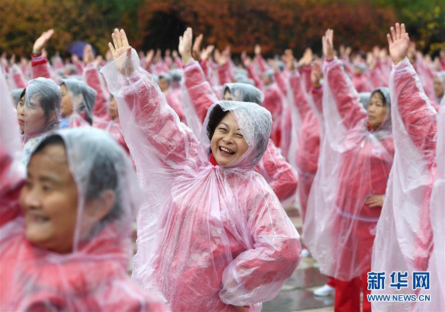 11月7日,在武漢黃陂云霧山,廣場舞愛好者一同起舞。當日上午,在天津、北京、上海、武漢、濟南等14個城市的不同場地上,50085人共同起舞,創(chuàng)下新的最大規(guī)模排舞(多場地)吉尼斯世界紀錄。新華社記者肖藝九攝