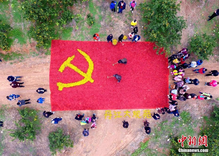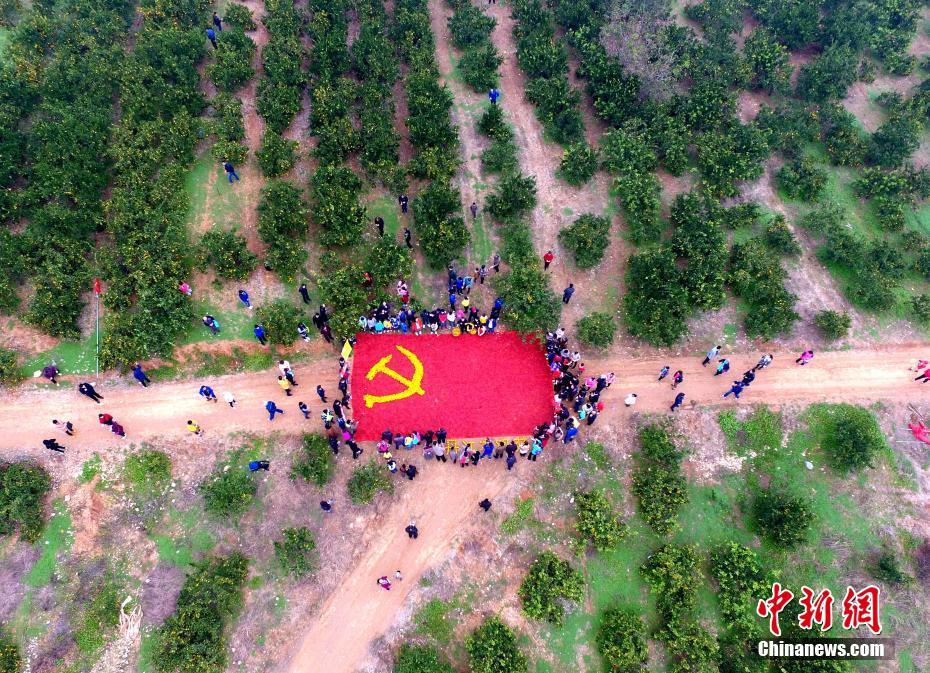 11月6日,南水北調(diào)中線工程水源地——河南淅川丹江大觀苑,滿園的桔子喜獲豐收,枝頭上碩果累累,多位農(nóng)民在桔子地里用豐收的金黃桔子和當(dāng)?shù)氐奶禺a(chǎn)紅辣椒拼成鮮艷奪目的巨幅黨旗。一位農(nóng)民告訴記者,為了拼這幅圖案,他們十幾個人整整用了兩天時間。吳揚(yáng) 攝