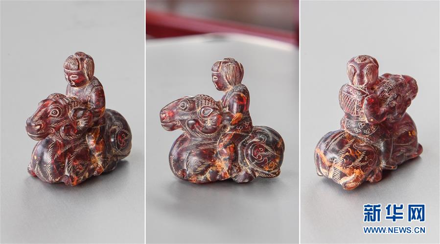 這是河南洛陽(yáng)市西朱村曹魏大墓出土的琥珀人物騎羊雕刻件(2016年11月8日攝)。新華社記者李賀攝