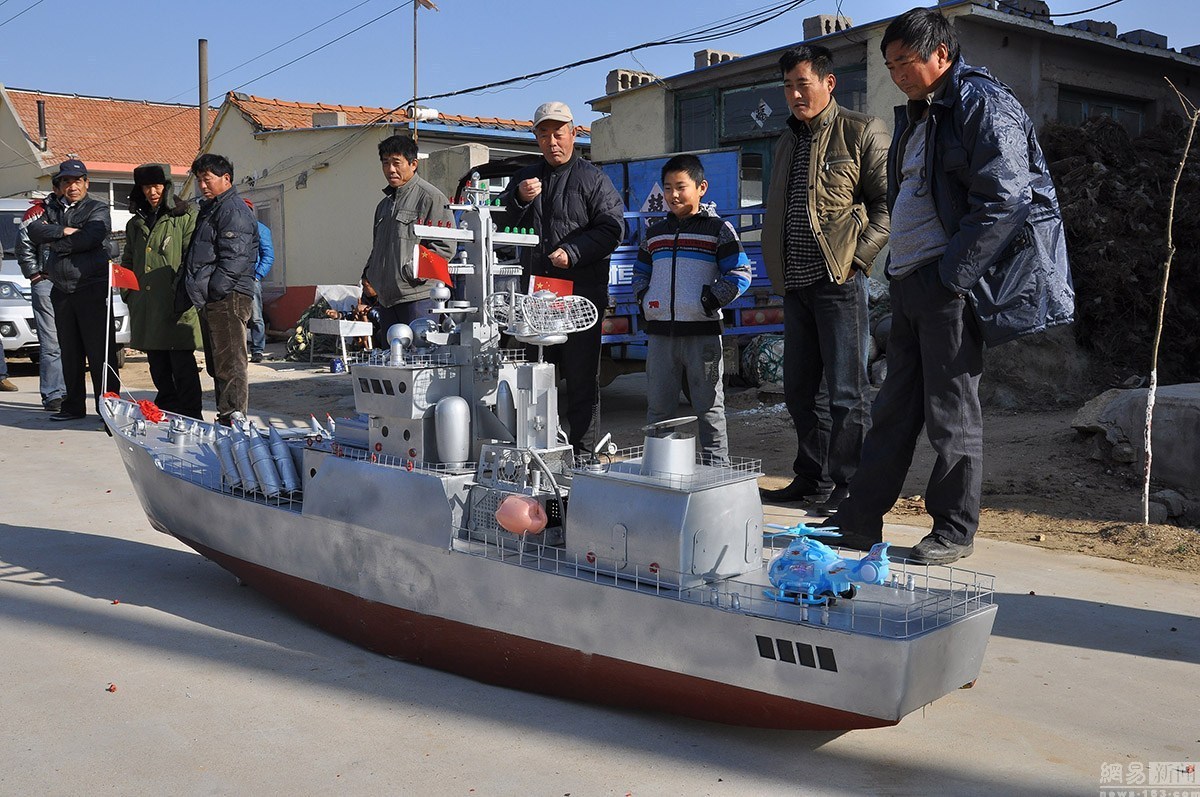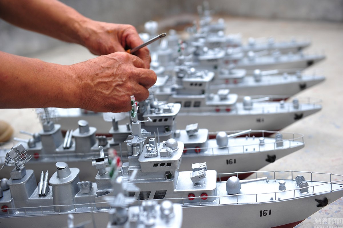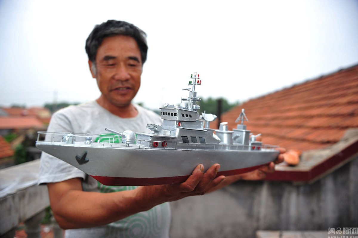 郭長海,初小文化,當過27年的船長。2005年,迫于海洋漁業(yè)的枯竭,他將漁船賣掉。但是仍然割舍不了對大海的依戀之情。平時,他喜歡從電視上了解國家大事,最愛看軍事頻道,耳濡目染,于是對軍艦產(chǎn)生了濃厚的興趣。農(nóng)閑的時候,郭長海便琢磨起了艦艇模型的制作。