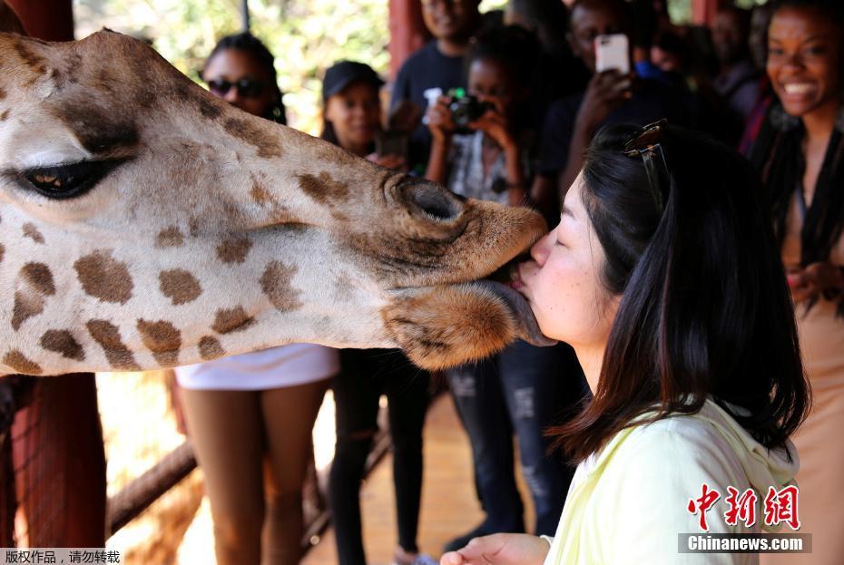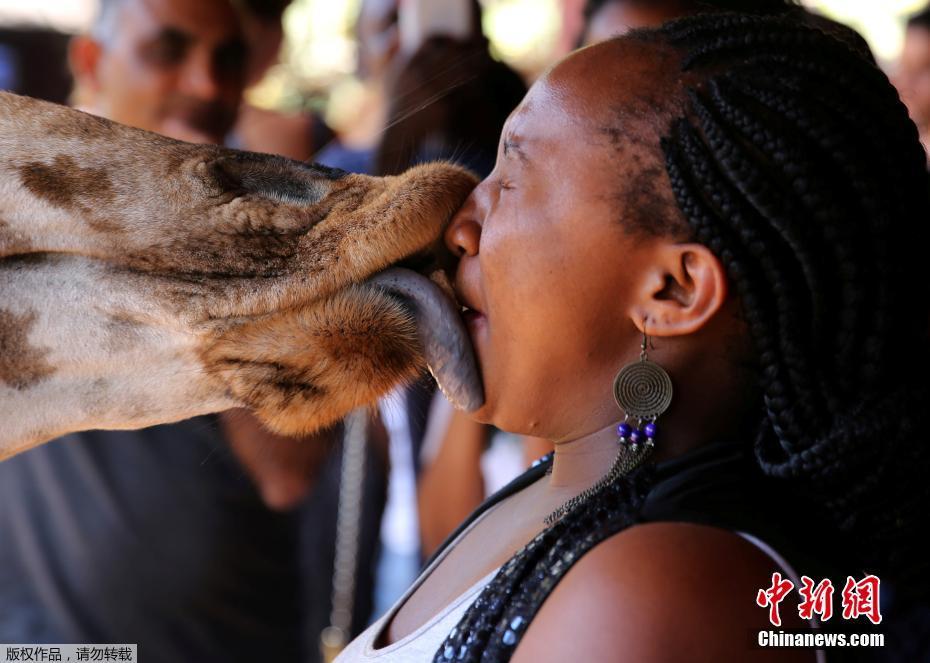當(dāng)?shù)貢r間1月15日,肯尼亞內(nèi)羅畢的一個動物園內(nèi),游客用嘴喂食長頸鹿,人與動物親密接觸,其樂融融。