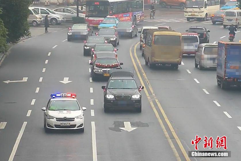 2月22日,湖北宜昌一位新郎在迎親時(shí),迎親車隊(duì)的頭車因涉嫌套牌被交警查獲。在新郎家屬和交警溝通后,當(dāng)?shù)亟痪诵曰瘓?zhí)法,先“開道護(hù)送”,迎親結(jié)束后才扣下套牌車。圖為警車“護(hù)送”新人完成儀式。石寧 攝