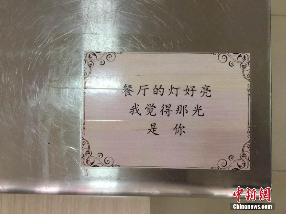 記者16日在西北政法大學(xué)雁塔校區(qū)綜合餐廳里看到,這些富有創(chuàng)意的三行情書貼于餐桌的右下角,語(yǔ)句詼諧幽默,浪漫十足,不時(shí)有買飯路過(guò)的學(xué)生駐足觀看,還有人拿出手機(jī)拍照。不少慕名而來(lái)的外校生專程前來(lái)蹭飯,體會(huì)“樸素的食堂愛情故事”。燕武 阿琳娜 攝影報(bào)道