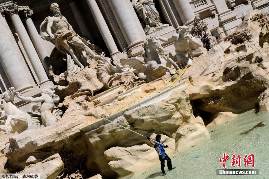 當(dāng)?shù)貢r間2017年5月2日,意大利羅馬,一名工人在特萊維噴泉里收集硬幣。每年從噴泉里收集到的硬幣大約價值100萬歐元。