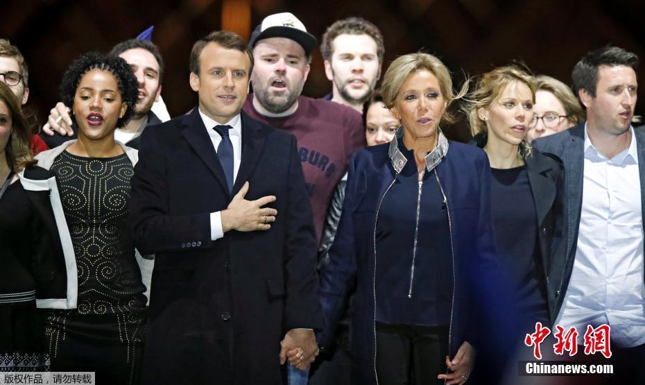 巴黎時間5月7日晚,法國總統(tǒng)選舉第二輪投票初步計票結(jié)果顯示,中間派獨立候選人、“前進”運動領(lǐng)導(dǎo)人埃馬紐埃爾·馬克龍以大幅優(yōu)勢擊敗極右翼政黨“國民陣線”候選人馬麗娜·勒龐。年僅39歲的馬克龍由此成為法國史上最年輕的總統(tǒng),也成為世界上最年輕的大國領(lǐng)導(dǎo)人。圖為馬克龍(左二)和妻子布麗吉特(右二)在慶祝勝選的集會上向支持者致意。中新社記者 龍劍武 攝