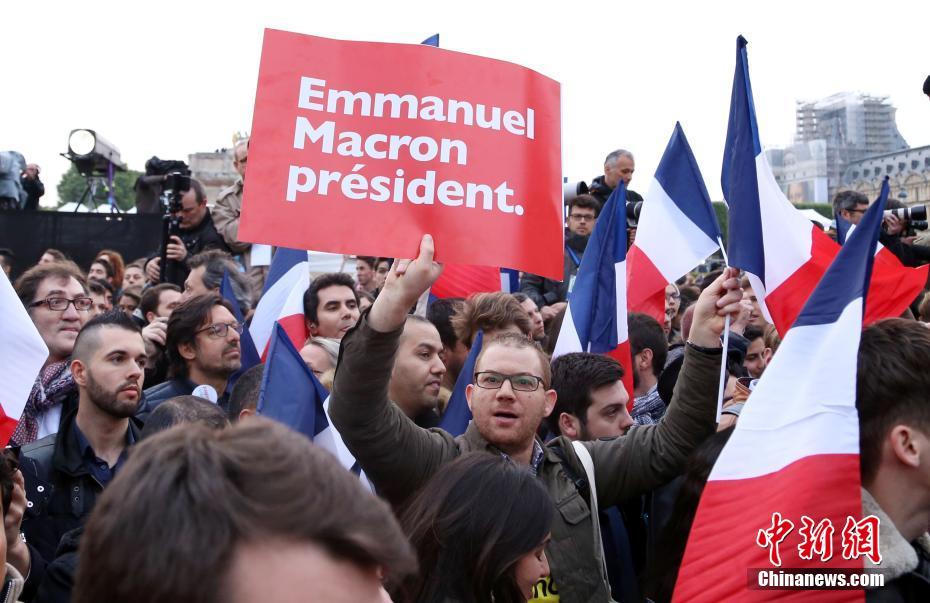 巴黎時間5月7日晚,法國總統(tǒng)選舉第二輪投票初步計票結(jié)果顯示,中間派獨立候選人、“前進”運動領(lǐng)導(dǎo)人埃馬紐埃爾·馬克龍以大幅優(yōu)勢擊敗極右翼政黨“國民陣線”候選人馬麗娜·勒龐。年僅39歲的馬克龍由此成為法國史上最年輕的總統(tǒng),也成為世界上最年輕的大國領(lǐng)導(dǎo)人。圖為馬克龍的支持者在得知馬克龍當(dāng)選后歡呼。中新社記者 龍劍武 攝