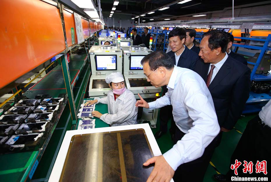 5月8日至9日,中共中央政治局常委、國務(wù)院總理李克強在河南省委書記謝伏瞻、省長陳潤兒陪同下,在開封、新鄉(xiāng)、鄭州考察。圖為5月9日,李克強考察鄭州富士康科技園。中新社記者 劉震 攝