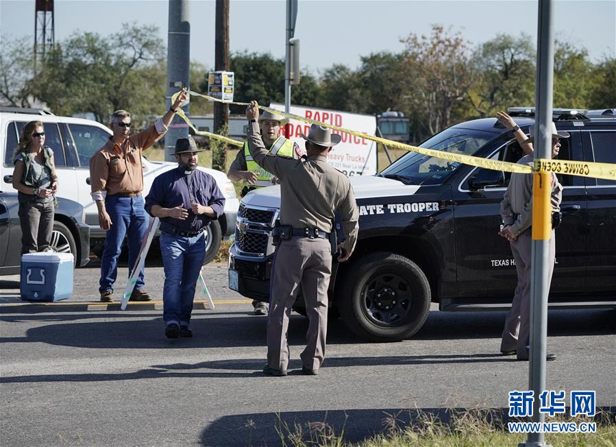 11月5日,在美國得克薩斯州南部薩瑟蘭斯普林斯鎮(zhèn),執(zhí)法人員在槍擊事件現(xiàn)場工作。美國得克薩斯州南部薩瑟蘭斯普林斯鎮(zhèn)一所教堂5日發(fā)生槍擊事件。警方向當?shù)孛襟w證實,槍擊至少造成27人死亡、多人受傷。 新華社/美聯(lián)
