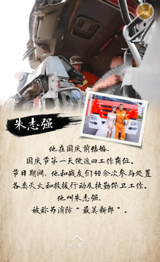 他在國慶前結婚,國慶節(jié)第一天便返回工作崗位。節(jié)日期間,他和戰(zhàn)友們40余次參與處置各類滅火和救援行動及執(zhí)勤保衛(wèi)工作。他叫朱志強,被稱為消防“最美新郎”。