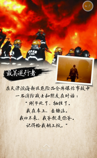 在天津濱海新區(qū)危險品倉庫爆炸事故中,一名消防戰(zhàn)士和朋友在對話:“剛子死了,犧牲了。我在車上,去塘沽。我回不來,我爸就是你爸。記得給我媽上墳。”