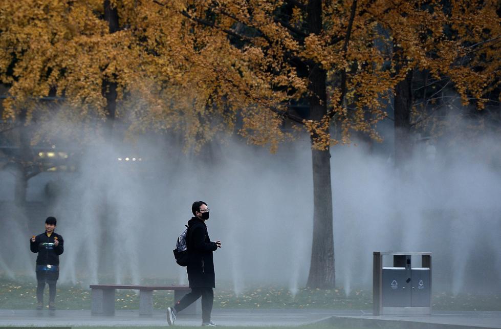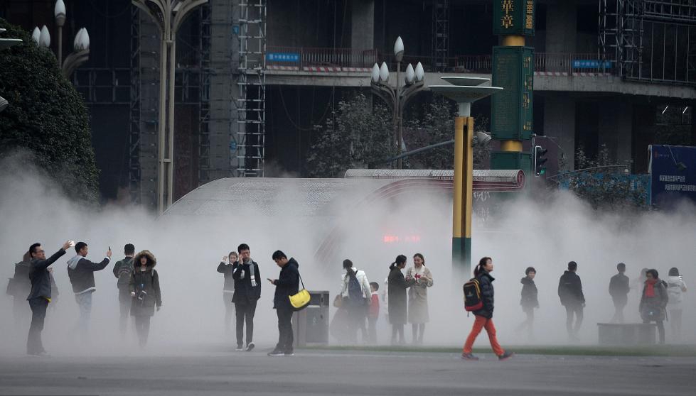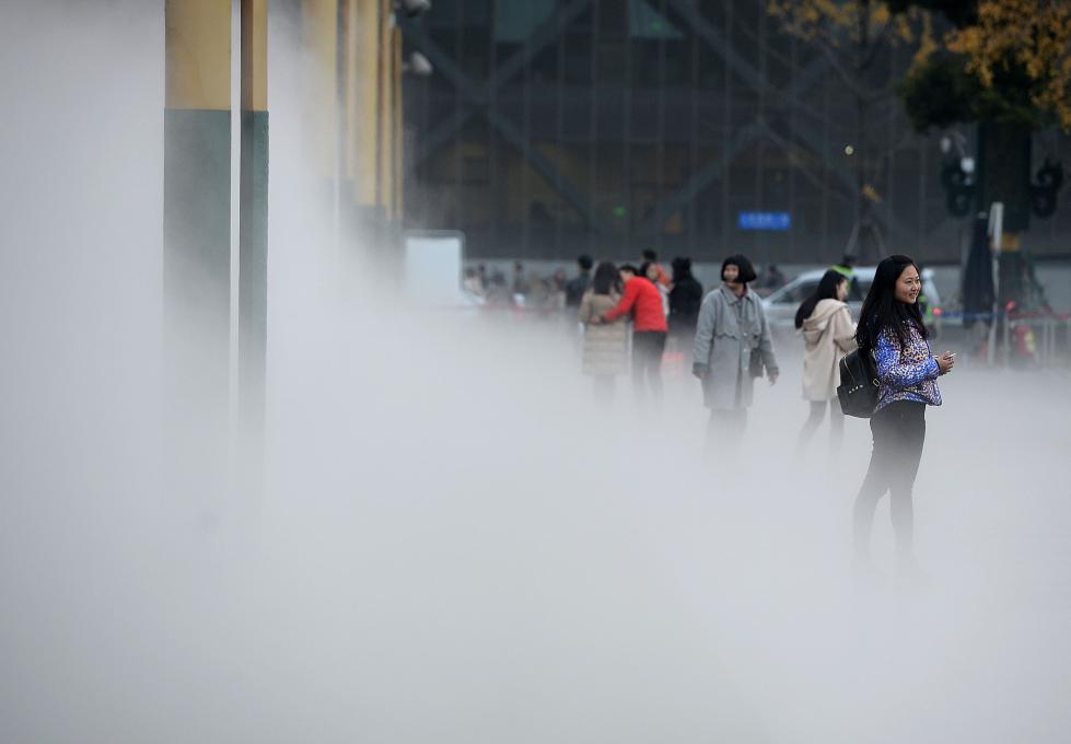 2017年12月23日,成都。天府廣場(chǎng)西側(cè)和南側(cè)有了新變化——上午10點(diǎn),綠油油的草坪上空開始籠罩著層層白色霧氣,仿佛置身于仙境一般。走近一點(diǎn),還有水霧襲來(lái),平添一分清新和涼意。