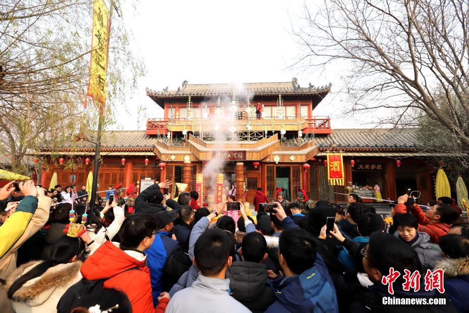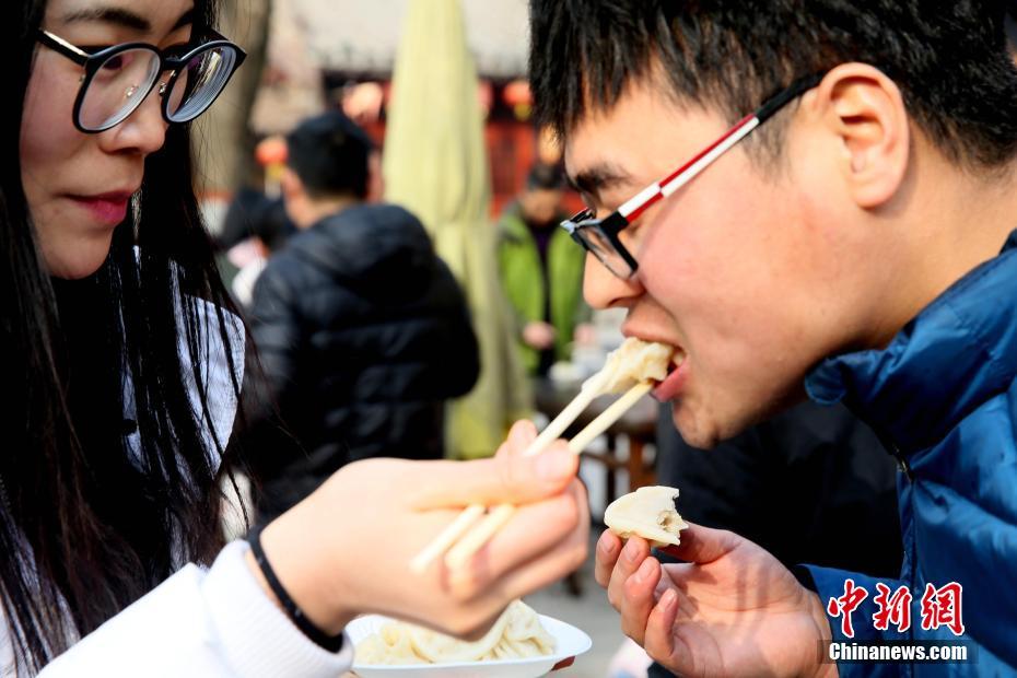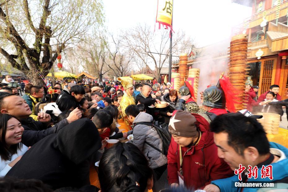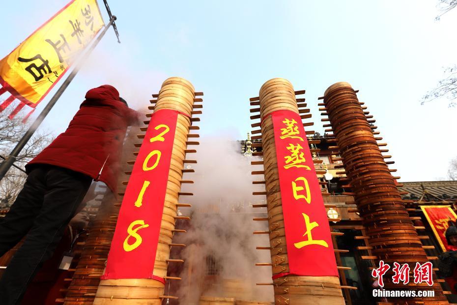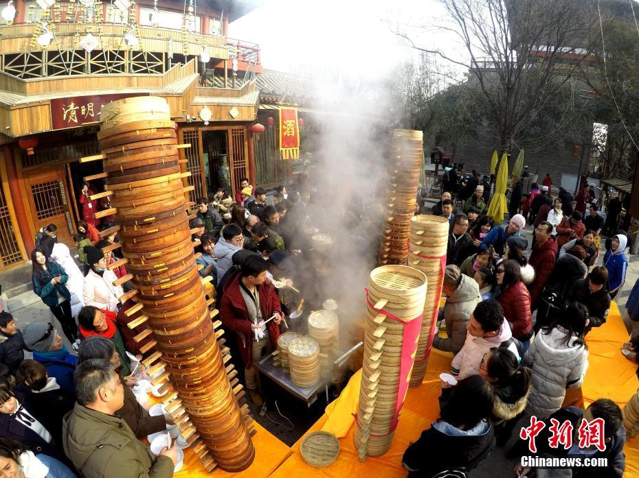 2018年1月1日,河南開(kāi)封清明上河園孫羊正店門前,現(xiàn)場(chǎng)高高疊起的小籠包熱氣騰騰,小籠包上喜慶的紅字寫(xiě)著“2018”“蒸蒸日上”。“宋徽宗”帶領(lǐng)“后宮佳麗”為游客免費(fèi)發(fā)放剛剛蒸好的小籠包,寓意新的一年“蒸蒸日上”,吸引數(shù)千名游客爭(zhēng)相品嘗求好運(yùn)。據(jù)清明上河園市場(chǎng)部石經(jīng)理介紹,為了給游客送上這份新年祝福,清明上河園啟用了多個(gè)地方一起蒸小籠包,當(dāng)天共準(zhǔn)備了2018籠開(kāi)封名吃“灌湯包”,在多個(gè)發(fā)放點(diǎn)陸續(xù)為民眾送上新年的“免費(fèi)午餐”,祝愿大家都能夠在新的一年里“蒸蒸日上”。中新社記者 王中舉 攝