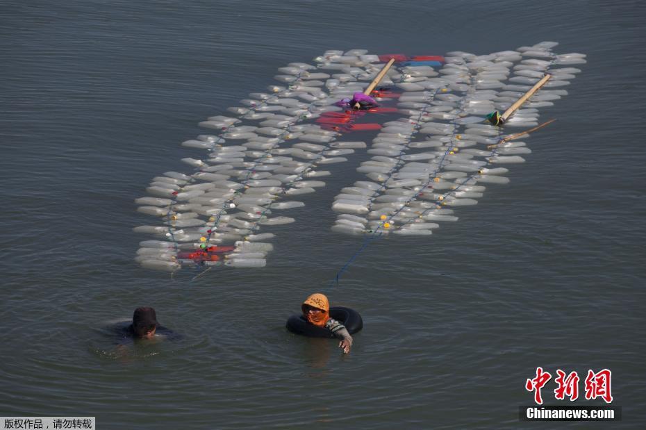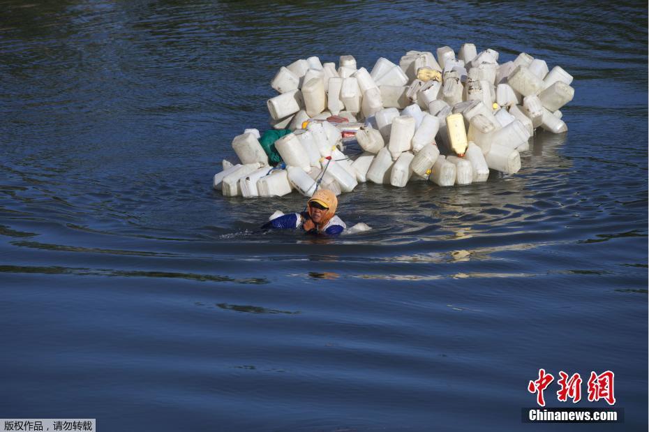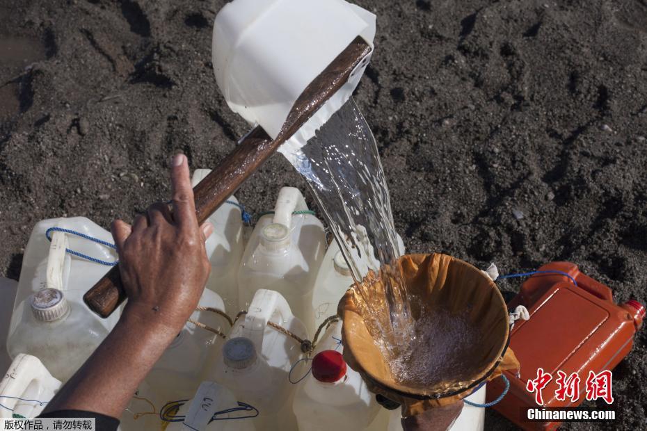 當(dāng)?shù)貢r間2018年3月21日, 印尼西蘇拉威西省Tinambung,村民Mama Hasria和其他當(dāng)?shù)嘏悦刻毂澈笙抵s200個空壺子逆流而上,到河上游為他們的社區(qū)打干凈的水。