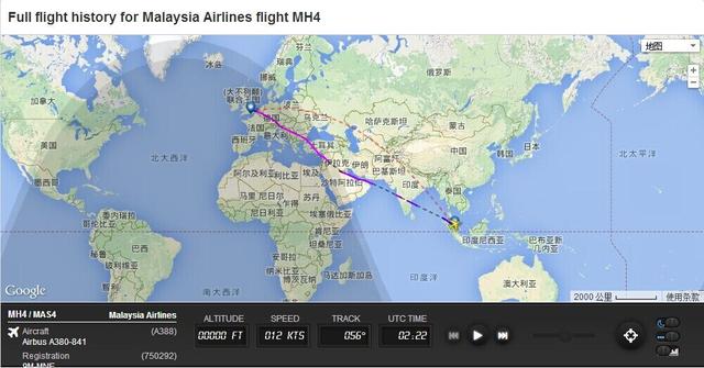圖為馬航MH4在7月20日的完整航線,從吉隆坡起飛,經(jīng)過伊拉克、敘利亞領(lǐng)空飛往倫敦。
