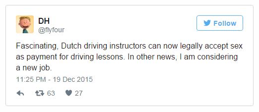 據(jù)荷蘭新聞(Dutchnews)網(wǎng)站12月14日?qǐng)?bào)道了該國(guó)議會(huì)一件令人震驚的決議——駕校教練可以用性回報(bào)代替現(xiàn)金來收費(fèi)。這一消息引起媒體大嘩,大約一周后(21日),各國(guó)媒體議論紛紛。赫芬頓郵報(bào)的副標(biāo)題就是“Ride for a ride”意為可以用性來換一段路程,CNN報(bào)道稱:“Go Dutch”現(xiàn)在有了新的意味,因?yàn)闅W洲男性開始涌向荷蘭,遞交擔(dān)任駕校教練申請(qǐng)。根據(jù)荷蘭政府方面的消息,申請(qǐng)量比之前增加了5倍。