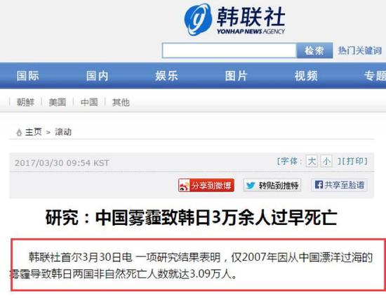 韓聯(lián)社是這樣說(shuō)的,一項(xiàng)研究結(jié)果證明,從中國(guó)漂洋過(guò)海的霧霾導(dǎo)致了韓日兩國(guó)有3萬(wàn)余人過(guò)早死亡, 并配上了一幅悲情的“霧霾圖”。