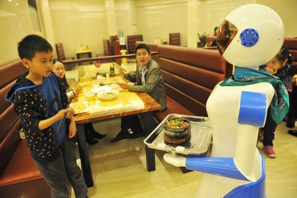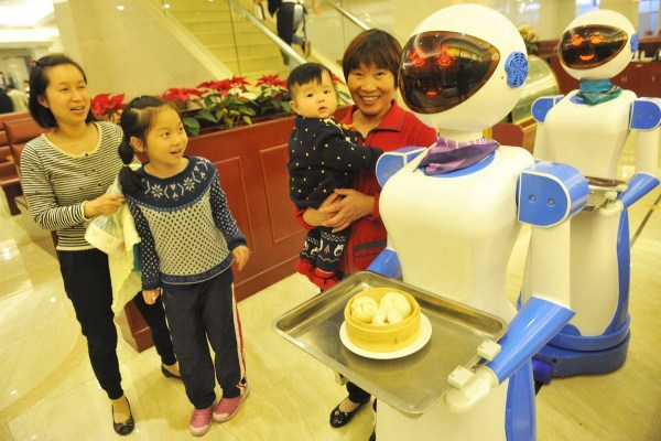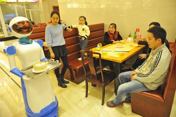 11月24日,浙江寧波聯(lián)盛廣場(chǎng)的一家港式餐廳推出了機(jī)器人送餐服務(wù),"她們"端著顧客點(diǎn)的食物,在餐廳里滑行前進(jìn),到點(diǎn)餐的餐桌,會(huì)自動(dòng)停下來(lái),用普通話向顧客播報(bào)“您點(diǎn)的餐,請(qǐng)慢用”。新奇的創(chuàng)意吸引了許多市民前來(lái)體驗(yàn)。郭小鎧/CFP