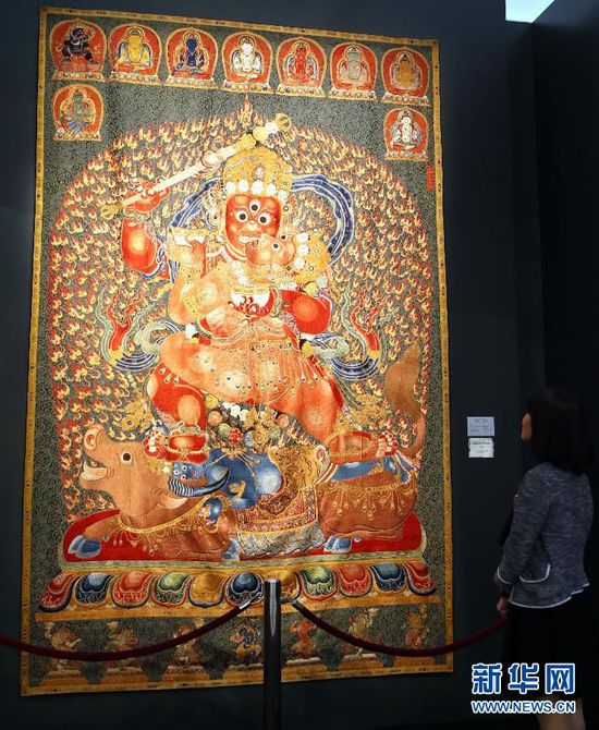 一位觀眾在香港佳士得2014年秋季拍賣(mài)會(huì)預(yù)展上觀看明永樂(lè)御制紅閻摩敵刺繡唐卡(11月21日攝)。新華社記者李鵬攝
