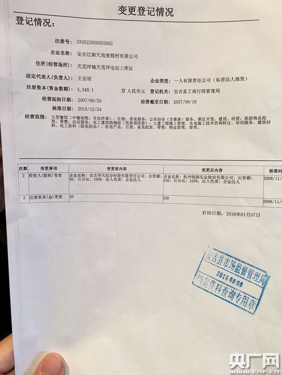 記者查詢安吉縣工商局登記信息發(fā)現(xiàn),江南天池度假村的前身就是天荒坪電站的三產(chǎn),天荒坪電站綜合經(jīng)營公司,在2005年前屬于集體企業(yè),之后這家企業(yè)多次變身,成為了浙江錢源旅游開發(fā)股份有限公司,江南天池公司就是錢源的全資子公司,2010年后,兩家企業(yè)的法人代表變?yōu)殡娬厩肮飨醢才唷?/p>