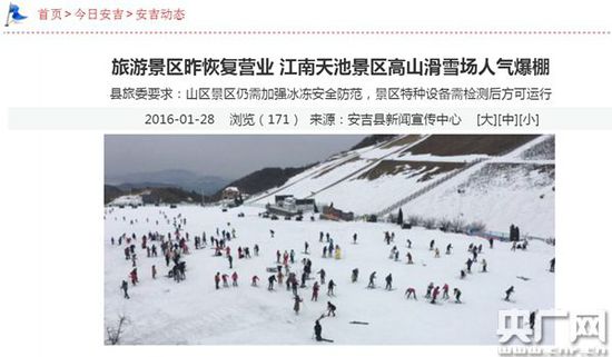 雖然安吉縣委宣傳部副部長祝青稱滑雪場營業(yè)馬上就結(jié)束了,但根據(jù)安吉縣政府官方網(wǎng)站報道,1月28號,江南天池滑雪場恢復(fù)營業(yè),人氣爆棚。