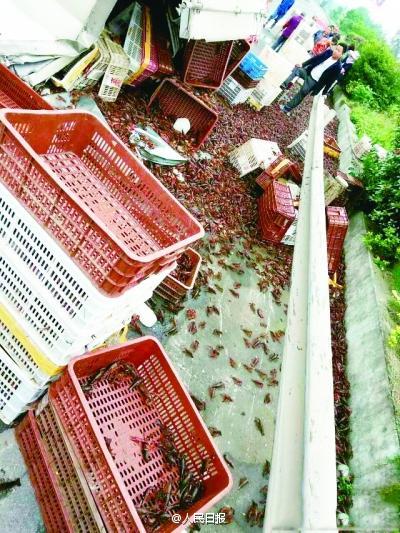 本報(bào)訊(記者魏娜 通訊員徐文匯)昨日中午,1輛滿載小龍蝦的貨車(chē)在漢宜高速上側(cè)翻,2000余公斤小龍蝦撒了一地。高速公路附近的村民聞?dòng)嵹s來(lái),拿著蛇皮袋、竹筐搶小龍蝦,車(chē)?yán)习寮绷?,攔住這個(gè)、跑了那個(gè),手忙腳亂。高速交警和派出所民警及時(shí)趕來(lái)控制現(xiàn)場(chǎng),保住大半的小龍蝦。