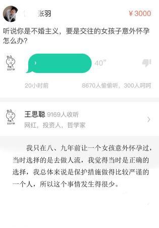 近日,某醫(yī)院醫(yī)生張羽在某平臺(tái)中向王思聰提問:“聽說你是不婚主義,要是交往的女孩子意外懷孕怎么辦?”在40秒的回答中,王思聰爆料自己毫不手軟:“我只在八九年前讓一個(gè)女孩意外懷過孕,但后來大家的選擇是流掉,我覺得是正確的選擇。 但現(xiàn)在我的保護(hù)措施是非常好的,一般不會(huì)有意外了?!鼻巴巴德牎钡木W(wǎng)友們紛紛表示:“老公坦誠得讓我震驚啊……”“感覺要上娛樂八卦頭條的節(jié)奏!”