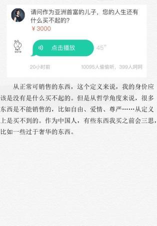 還有網(wǎng)友好奇首富獨(dú)子的消費(fèi)觀,問王思聰平均在每個(gè)女朋友身上的花費(fèi)是多少。王思聰給出的答案依然很實(shí)在:“從我17、8歲初戀到現(xiàn)在十幾年了,在每個(gè)女朋友身上的消費(fèi),完全取決于當(dāng)年的我有多少錢,十七八歲的時(shí)候錢也不多,或許會(huì)買的幾百幾千的飾品,但隨著自己歲數(shù)越來越大,也會(huì)買幾萬,甚至幾十萬的東西,很難算出平均的花費(fèi),有一點(diǎn)是確定的,隨著歲數(shù)越來越大,可支配的資金越來越多,在每個(gè)女朋友身上花的錢是越來越多的。”