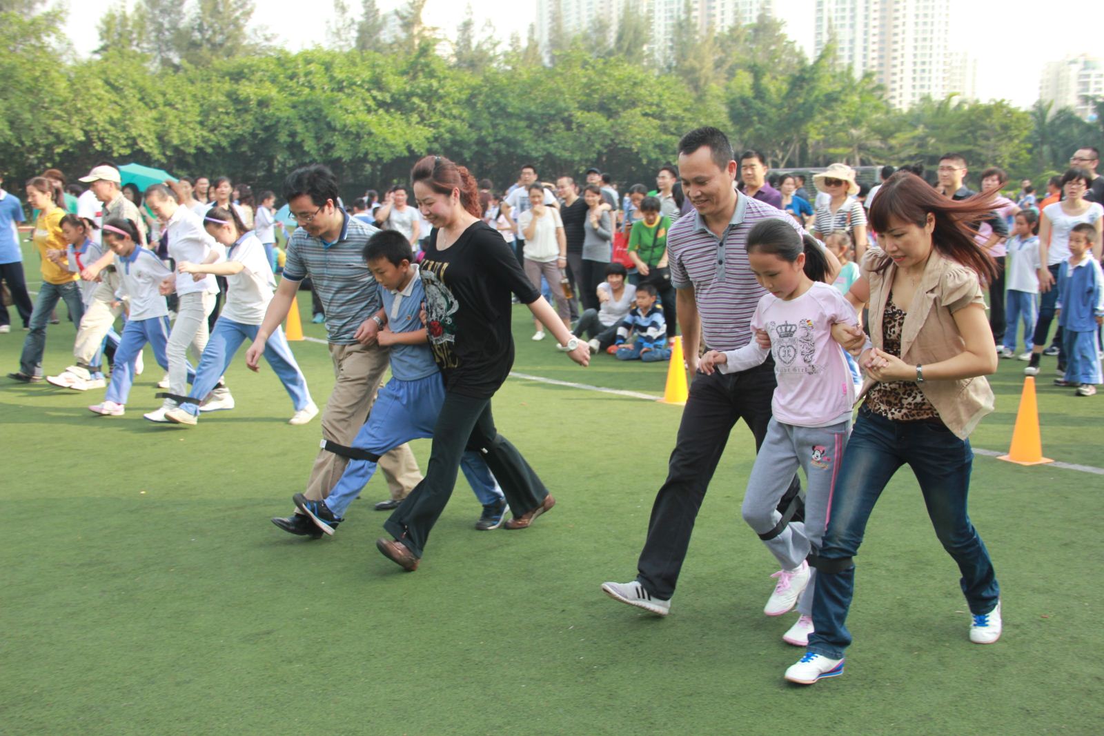 游戲規(guī)則:活動(dòng)分組進(jìn)行,每個(gè)家庭(兩大一小)為一組,家長(zhǎng)在兩邊,孩子在中間,家長(zhǎng)和孩子相鄰的兩條腿用10cm寬,60cm長(zhǎng)的紅色布條綁住,聽(tīng)到口令后,三人一齊向前跑,看誰(shuí)先跑到終點(diǎn)為勝。(每組最多為5個(gè)家庭參與,活動(dòng)分三組進(jìn)行)