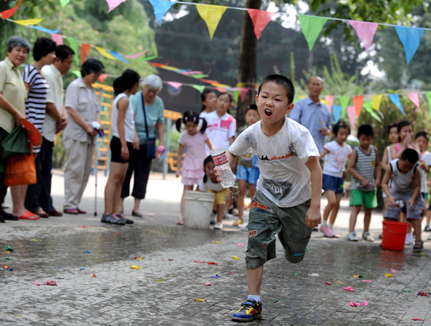 游戲規(guī)則:跑道前方設(shè)置一個(gè)水桶 起點(diǎn)外設(shè)置一個(gè)大塑料瓶,比賽開(kāi)始時(shí),小朋友持水杯到水桶內(nèi)盛水后返回倒入大塑料瓶處,由孩子和兩個(gè)家長(zhǎng)依次進(jìn)行盛水接力,大塑料瓶盛滿水者為勝(注:塑料瓶身內(nèi)設(shè)若干漏點(diǎn))?;顒?dòng)共7個(gè)家庭參與,取前三名進(jìn)行頒獎(jiǎng),所有參與的家庭均有參與獎(jiǎng)。