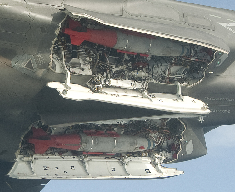 3月2日,美國(guó)洛-馬公司生產(chǎn)的F-35B BF-03試驗(yàn)機(jī)加掛兩枚JDAM制導(dǎo)炸彈升空試飛。試飛過(guò)程中,F(xiàn)-35B開(kāi)啟隱藏式彈艙玩起橫滾機(jī)動(dòng)。圖為-35B BF-03隱藏式彈艙細(xì)節(jié)。