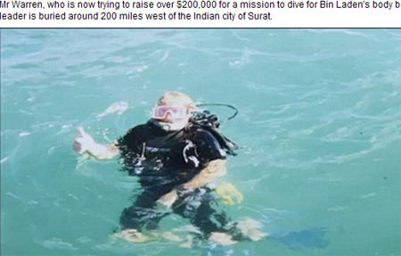 這位尋寶者名叫比爾·沃倫(Bill Warren),現(xiàn)年60歲。他稱發(fā)現(xiàn)了拉登遺體的具體位置,就在距離印度西部港口城市蘇拉特(Surat)以西320公里處的阿拉伯海底。他現(xiàn)在正努力籌集20萬美元(約合126萬元人民幣)經(jīng)費(fèi),以潛入海底尋找拉登的裝尸袋。
