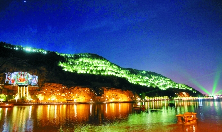 夜色下的龍門(mén)在各色燈光的映照下美輪美奐,萬(wàn)千佛陀現(xiàn)金身。記者 陳曉東 攝 啟天 制圖