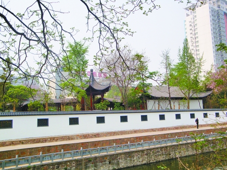 昨日上午,記者在現(xiàn)場看到了這座袖珍式高檔花園,其外部是兩米高的圍墻(如圖)。遠(yuǎn)遠(yuǎn)看去,里面亭臺(tái)樓閣樣樣俱全,還栽滿各色花木。透過墻上的鏤空窗,記者看到木質(zhì)長廊將各建筑連為一體,園子正中還堆有假山。有工作人員正在里面施工,出入口則設(shè)立著擋板。有市民質(zhì)疑稱,現(xiàn)在不少地方都拆墻透綠了,這么好的景致為何圍上不讓欣賞。