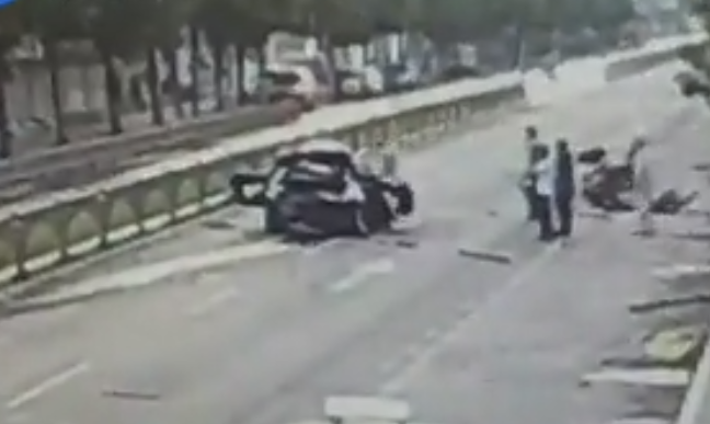 監(jiān)拍濟南寶馬車撞斷15節(jié)護欄