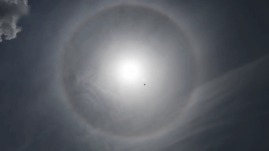 飛機“橫穿”巨大日暈被抓拍