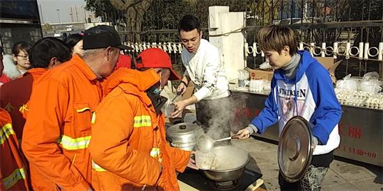 另一邊,在鄭州市花園路廣電南路交叉口,主持人劉雯和韓佳帶著十幾名義工早早的在路邊就開始忙活了。他們要給附近50多名環(huán)衛(wèi)工人煮餃子。平時,環(huán)衛(wèi)工們的午飯都很簡單,甚至都是隨便對付的,這次,主持人和義工們特意選在離工人們中午休息比較近的地方,搭起了臨時的灶臺,給工人們做上一頓熱騰騰的餃子。由于條件簡陋,臨時灶臺上的火十分不穩(wěn)定,劉雯和韓佳脫下厚重的外套,擼起袖子親自生火,費(fèi)了好大勁終于把餃子下鍋了。吃上熱騰騰的餃子,環(huán)衛(wèi)工人們特別開心。一位老大爺由衷的感嘆道:“好久沒吃過這么暖心的午飯了,謝謝你們。”