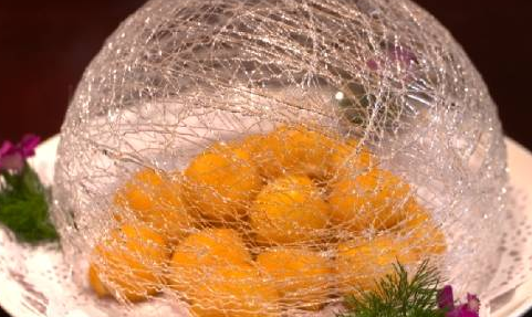 宛如藝術(shù)品一般的金玉滿(mǎn)堂,一上桌就抓人眼球。真正體現(xiàn)了店家精益求精,精雕細(xì)琢的態(tài)度。融化的冰糖織就像銀絲穹頂,覆蓋在“金球”之上使整道菜更添一絲朦朧。拿出一顆金黃的山藥球,咬開(kāi)脆皮一股奶香便充斥口腔,奶香散盡后山藥泥的甘甜軟糯便呈現(xiàn)出來(lái),滿(mǎn)口生津卻又香而不膩,非常適合女士。