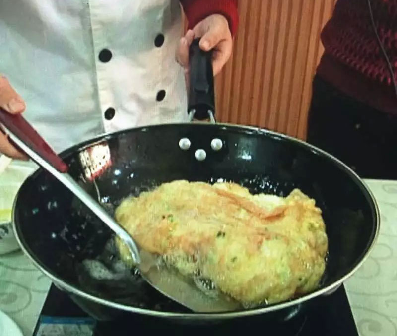 第三步,放入一點鹽等調(diào)料之后將拌入肉末的蛋液放入油鍋煎炒,成熟以后出鍋。