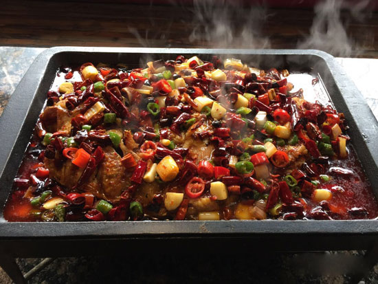 4、用青紅辣椒,蔥姜蒜,以及料酒,紅油,鹽,少量雞精調(diào)味,爆炒制作湯汁和配料,澆到之前烤好的鮰魚上。