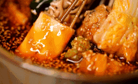 精心熬制四個(gè)小時(shí)的紅油,加了各種香料的冰鎮(zhèn)底湯,撒上用油炒的噴香的芝麻,合而為一才是冷鍋串的精髓,串串全部放入大缽缽中,再澆上香氣濃郁的料湯,食材吸收料湯后開始入味,浸泡的時(shí)間越久就越好吃,而最正宗的吃法還要加冰,想想這冰爽。