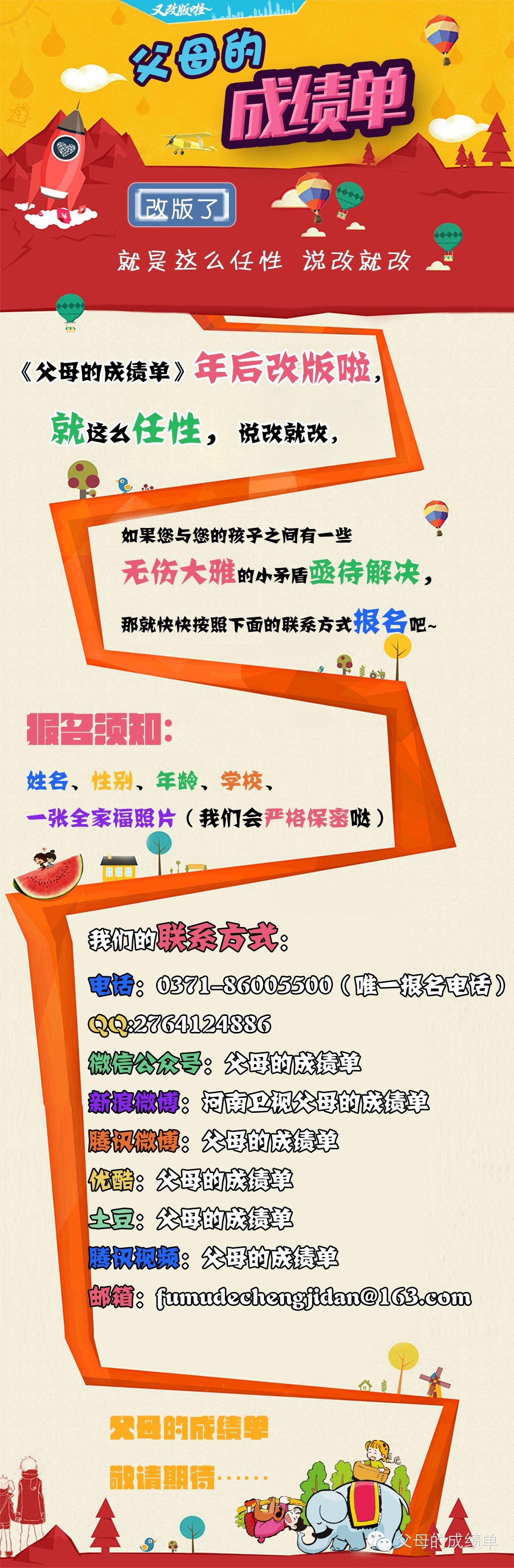 年后,經(jīng)過導(dǎo)演大大和眾小編們的熱切商討,《父母的成績(jī)單》又改版啦。我們就是這樣任性,說改就改,為了什么?為了讓可敬可愛的觀眾朋友們看到更優(yōu)質(zhì)更具有內(nèi)涵的節(jié)目,希望你們能喜歡我們的節(jié)目,能感受到我們每一位幕后工作者的用心付出。我們真誠(chéng)的期望每一位家長(zhǎng)都能耐心的用更好的方式來與您的孩子溝通相處,更期望每一位孩子都能健康快樂的成長(zhǎng)。