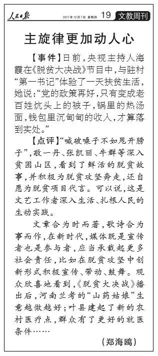 評(píng)論中還指出,文章合為時(shí)而著,歌詩(shī)合為事而作,在新時(shí)代,媒體既是宣傳者也是參與者,應(yīng)當(dāng)承載起更多社會(huì)責(zé)任,比如在脫貧攻堅(jiān)中創(chuàng)新形式積極宣傳、帶動(dòng)、鼓舞。觀(guān)眾欣喜地看到,《脫貧大決戰(zhàn)》播出后,河南蘭考的“山藥姑娘”生意越做越好;葉縣建起了新的農(nóng)村醫(yī)療點(diǎn),群眾有了更好的就醫(yī)條件……