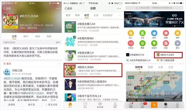 節(jié)目播出至今,“脫貧大決戰(zhàn)”早已在網(wǎng)絡(luò)社交平臺(tái)上引起了網(wǎng)友熱議。人民網(wǎng)、光明網(wǎng)、央視網(wǎng)、中國(guó)網(wǎng)、環(huán)球網(wǎng)、騰訊、新浪、網(wǎng)易、今日頭條、百度等數(shù)百家媒體進(jìn)行轉(zhuǎn)載,新浪微博、微信公眾號(hào)等大量自媒體號(hào)廣泛傳播。統(tǒng)計(jì)顯示,截至11月30日,《脫貧大決戰(zhàn)》在新浪微博話(huà)題綜合榜上排名第七,全國(guó)綜藝榜排名第二,新浪微博閱讀量達(dá)到了7990萬(wàn)。