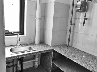 廚房里操作臺(tái)、灶臺(tái)、洗菜池已安裝到位。