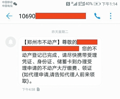 大河報(bào)記者了解到,鄭州市不動(dòng)產(chǎn)登記中心目前正式推出了業(yè)務(wù)辦結(jié)的短信提醒服務(wù)。當(dāng)不動(dòng)產(chǎn)登記部門在辦結(jié)申請(qǐng)人的相關(guān)申請(qǐng)后,便會(huì)給申請(qǐng)人(代理人)發(fā)去短信,提醒其及時(shí)前往不動(dòng)產(chǎn)登記部門領(lǐng)取不動(dòng)產(chǎn)登記證書、證明?!皬臉I(yè)務(wù)辦結(jié)到領(lǐng)證還有一些內(nèi)部流轉(zhuǎn)程序,一般情況下,我們都是在繕證完成后24小時(shí)發(fā)送短信。”相關(guān)負(fù)責(zé)人介紹說(shuō)。