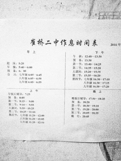 悲痛之余,佳佳的伯伯質(zhì)疑學(xué)校規(guī)定的作息時間存在不合理狀況。記者從其提供的該校作息時間表上看到,該校針對所有學(xué)生規(guī)定的早上起床時間是凌晨5時20分,早操是5時40分至6時整,然后是早自習(xí)。