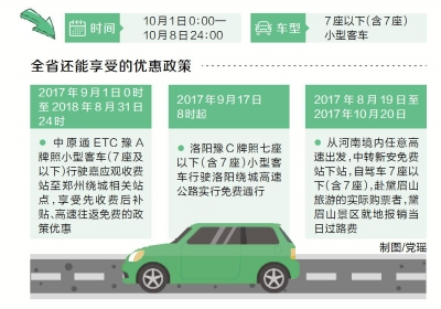 同時(shí),全省還能享受到除高速免費(fèi)以外的其他優(yōu)惠政策:從2017年9月1日0時(shí)至2018年8月31日24時(shí),中原通ETC豫A牌照小型客車(chē)(7座及以下)行駛嘉應(yīng)觀收費(fèi)站至鄭州繞城相關(guān)站點(diǎn),享受先收費(fèi)后補(bǔ)貼、高速往返免費(fèi)的政策優(yōu)惠;2017年9月17日8時(shí)起,洛陽(yáng)豫C牌照7座以下(含7座)小型客車(chē)行駛洛陽(yáng)繞城高速公路實(shí)行免費(fèi)通行;2017年8月19日至2017年10月20日,從河南境內(nèi)任意高速出發(fā),中轉(zhuǎn)新安縣下站,自駕7座以下(含7座)小型客車(chē)赴黛眉山旅游的實(shí)際購(gòu)票者,黛眉山景區(qū)就地報(bào)銷(xiāo)當(dāng)日過(guò)路費(fèi)。